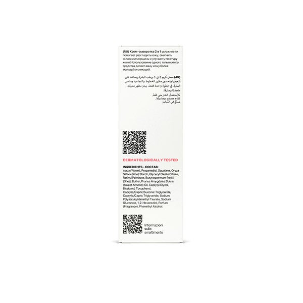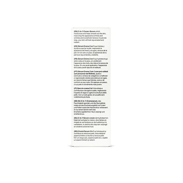 Sérum Crema 2 en 1 con pro-retinol al 0,3% (precursor del Retinol) que contribuye a activar la producción de colágeno y favorece la renovación celular para suavizar las arrugas, mientras hidrata, nutre y brinda una agradable sensación de confort en la piel del rostro.