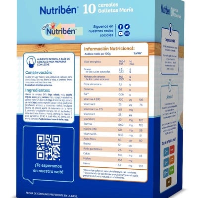 La papilla Nutribén 10 Cereales con Galletas María es una opción ideal para iniciar la dieta complementaria de tu bebé a partir de los 6 meses. Con un sabor irresistible gracias a las galletas María, esta papilla combina una alta calidad nutricional con la experiencia de una marca experta en alimentación infantil. Diseñada para contribuir al desarrollo saludable de tu pequeño, contiene 99% de cereales cuidadosamente seleccionados y una rica mezcla de vitaminas y minerales esenciales.