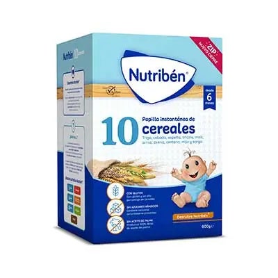 PAPILLA 10 CEREALES. Esta papilla es la única del mercado que reúne 10 tipos de cereales: trigo, cebada, espelta, triticale, arroz, avena, centeno, mijo, sorgo y maíz, los cuales representan el 99% de su composición. Puede introducirse en la alimentación de tu bebé a partir de los 6 meses.