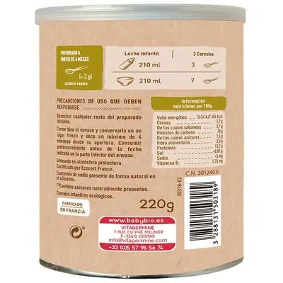 Papilla de cereales infantiles ecológicos con trigo, arroz y avena integral, desde los 8 meses. En biberón o con cuchara, los cereales infantiles Babybio ofrecen a los bebés la elección de los sabores. Cereales infantiles biológicos de trigo, arroz y avena integral. Son una fuente de hidratos de carbono complejos, fuente de energía y les ayudará a sentirse llenos y satisfechos. Puede contener restos de leche, gluten y soja.