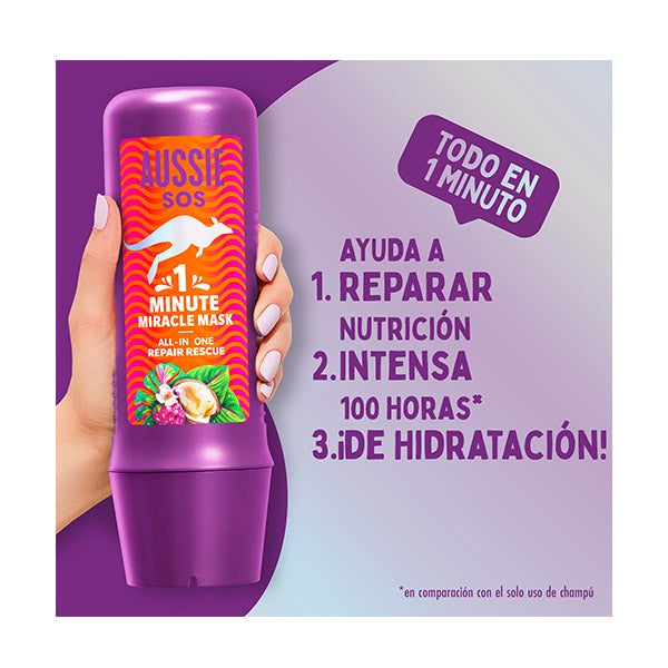 Aussie ha creado la mascarilla para el pelo SOS 1 Minute Miracle Mask Repair Rescue para que puedas disfrutar de una solución ultrarrápida para el cabello seco y dañado . Esta fórmula todo en uno, enriquecida con superalimentos australianos, repara y nutre intensamente en solo 60 segundos. Consigue un cabello increíblemente suave, liso e hidratado hasta por 100 horas. ¡Por fin podrás olvidarte de lo que es el encrespamiento! Características principales de SOS 1 Minute Miracle Mask Repair Rescue La SOS 1 Minute Miracle Mask Repair Rescue de Aussiees la mascarilla capilar todo en uno diseñada para el cabello seco y dañado que necesita un milagro en tiempo récord. Su característica principal es su acción instantánea: en solo 60 segundos , esta fórmula intensiva penetra en la fibra capilar para nutrir y reparar profundamente . Enriquecida con la potencia de los superalimentos australianos (como nuez de macadamia y fresa blanca), la mascarilla deja tu cabello suave, increíblemente liso y con un brillo renovado . Ofrece una hidratación duradera de hasta 100 horas, combatiendo la sequedad y el encrespamiento. Añádelo a tu estuche de cuidado del cabello y, con una sola aplicación, ya notarás el cambio: el cabello queda suave, suelto y con un brillo espectacular