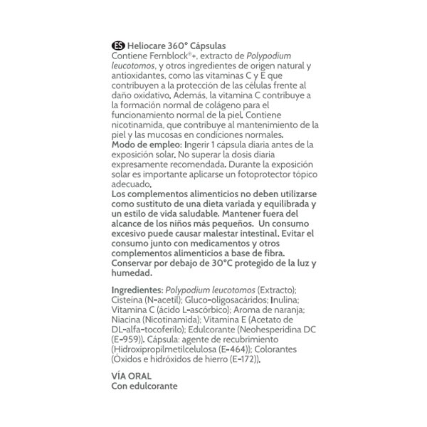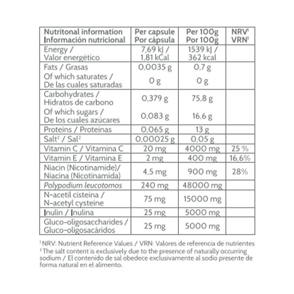 Polypodium leucotomos. Cisteína (N-acetil). Gluco-oligosacáridos. Inulina. Vitamina C (ácido L-ascórbico). Aroma de naranja. Vitamina B3 (niacinamida). Vitamina E (acetato de DL-alfa tocoferilo). Edulcorante (neohesperidina). Cápsula: hidroxipropilmetilcelulosa (agente de recubrimiento). Colorantes de cápsula: óxido de hierro amarillo (E-172), óxido de hierro negro (E-172), dióxido de titanio (E-171)
