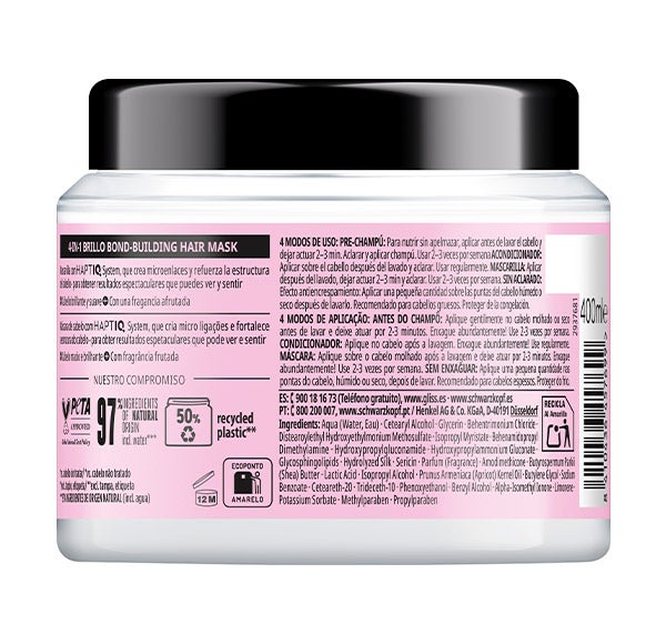 MASCARILLA: Aplicar después del champú, dejar actuar durante 2–3 minutos y enjuagar. Repetir de 2 a 3 veces semanalmente.