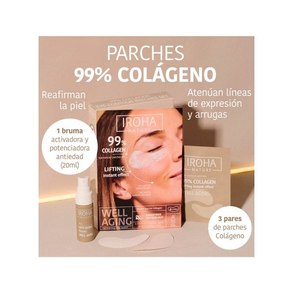 El Parches para el contorno de ojos 99% Collagen Lifting Effect de Iroha Nature une la tecnología avanzada de Electrospinning con una bruma activadora que deshace al momento las nanofibras, liberando el colágeno directamente en las capas más profundas de la piel.