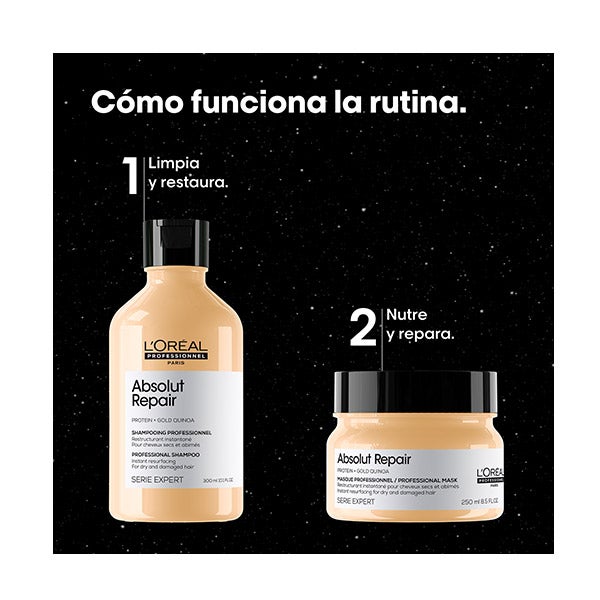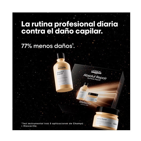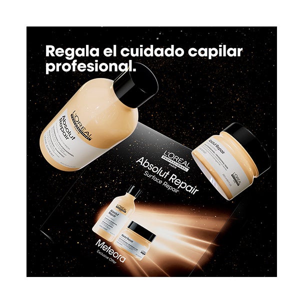 El set Absolut Repair (Champú + Mascarilla) combina proteínas de trigo con Omega 9, componentes que contribuyen a una reparación profunda de la fibra capilar y a mantener su elasticidad natural.