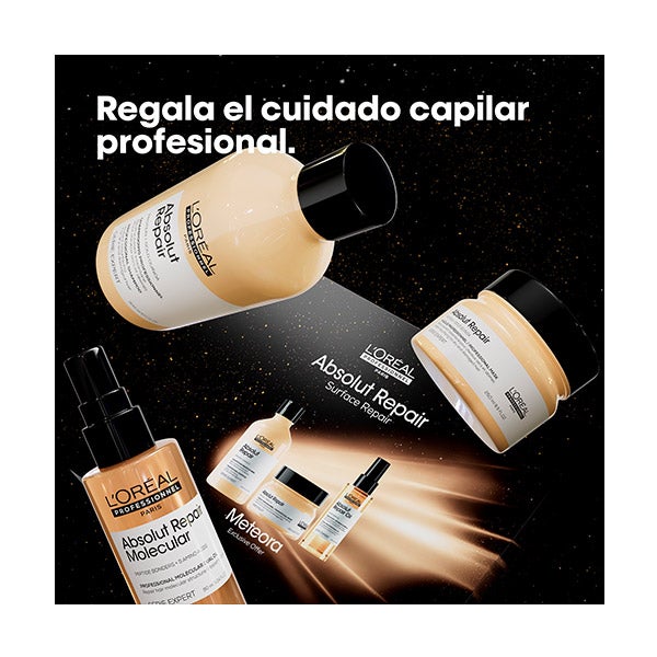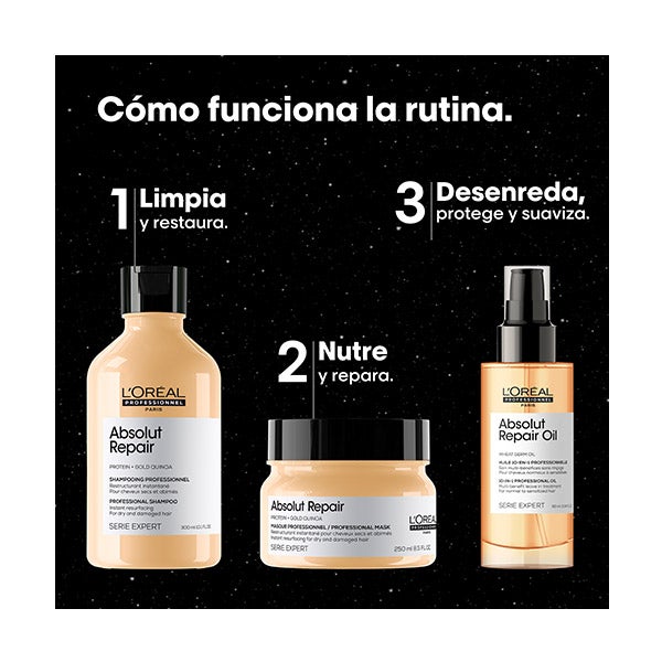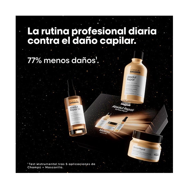 El set Absolut Repair (Champú + Mascarilla + Aceite capilar) está formulado con proteínas de trigo y Omega 9, que contribuyen a una reparación profunda de la fibra capilar y proporcionan mayor flexibilidad.