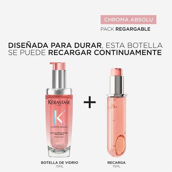 El aceite recargable Chroma Éclat aporta un resplandor prolongado al cabello teñido. Enriquecido con Centella Asiática, una planta silvestre de origen tropical, este aceite ayuda a mantener la intensidad del color mientras envuelve el cabello con un delicado y envolvente perfume.