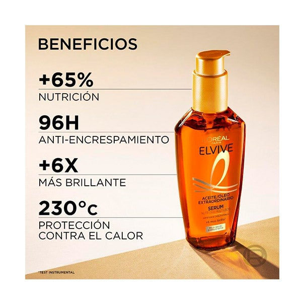 Renueva tu cuidado capilar con Elvive Aceite Extraordinario Sérum Nutritivo Multiusos, una fórmula ligera enriquecida con aceites de Camellia y Marula, creada especialmente para cabello seco. Este sérum multifuncional ofrece una nutrición profunda sin apelmazar, dejando el cabello suave, controlado y con un brillo intenso desde la primera aplicación. Su textura oleosa permite distintos usos: como tratamiento previo al lavado, combinado con el acondicionador para intensificar su efecto, como protector térmico frente a herramientas de calor de hasta 230ºC o como toque final que realza la luminosidad y sella el peinado.