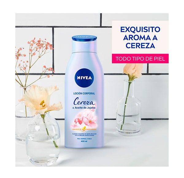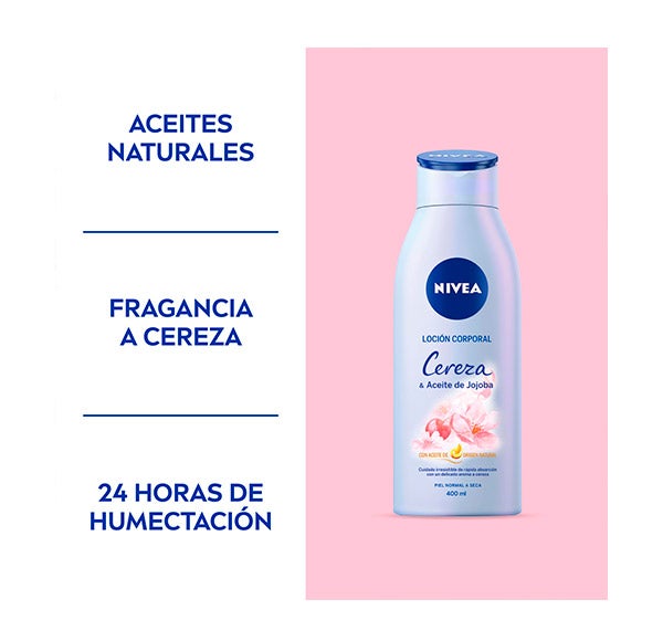 NIVEA Aceite en Loción Flor de Cerezo & Aceite de Jojoba combina el poder nutritivo del Aceite de Jojoba con un sutil perfume a flor de cerezo, brindando hidratación intensa por 24 horas sin dejar residuos grasos. Experimenta el cuidado del aceite en una loción NIVEA de rápida absorción. Transforma tu rutina de hidratación en un momento sensorial con el aceite en loción de NIVEA. Disfruta de una piel protegida, nutrida y envuelta en una fragancia envolvente: ¡hidratar tu piel será un verdadero placer!