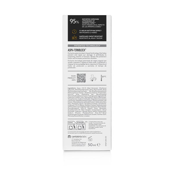 Fotoprotector avanzado de amplio espectro (UVB, UVA, luz visible e infrarroja) con SPF 50+, ideal para el cuidado diario de pieles grasas o con tendencia al acné.