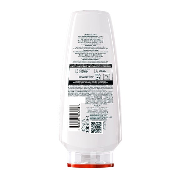 Reconstruye y fortalece la fibra capilar, dejando el cabello suave y con un aspecto sano. Una sola solución que combate los cinco signos del daño extremo: 1. Textura áspera 2. Fragilidad 3. Falta de hidratación 4. Rigidez 5. Puntas abiertas. Presenta un nuevo envase con diseño tipo diamante que utiliza un 20% menos de plástico**.