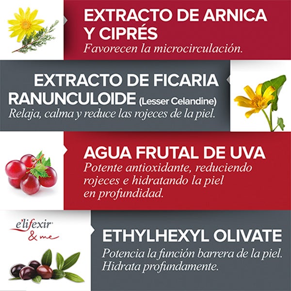 Extracto de Árnica y Ciprés: Concentrado hidroglicólico de extractos naturales de árnica, ciprés y Polygonatum multiflorum (sello de Salomón). Estas plantas, ricas en flavonoides, saponósidos y procianidoles, poseen una acción similar a la vitamina P, fortaleciendo los capilares, mejorando la microcirculación y promoviendo la eliminación de líquidos y toxinas acumuladas.