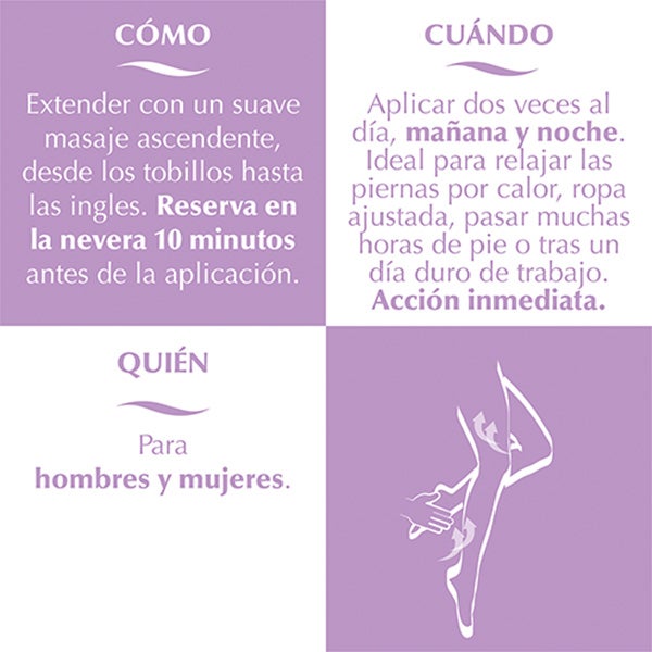 Extiéndelo realizando un suave masaje ascendente desde los tobillos hasta las ingles y, después, eleva las piernas para potenciar el descanso. Para una sensación extra de frescor y relax, colócalo en el refrigerador unos 10 minutos antes de aplicarlo.