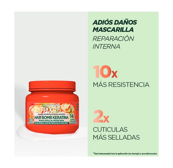 El Aceite de Marula, reconocido por su poder nutritivo, se une a la keratina para formar una sinergia efectiva que restaura la fibra capilar en profundidad y aporta hasta 10 veces más resistencia*. Con la Mascarilla Adiós Daños de Fructis, despídete del daño y disfruta de una melena más fuerte y reparada. *Test instrumental