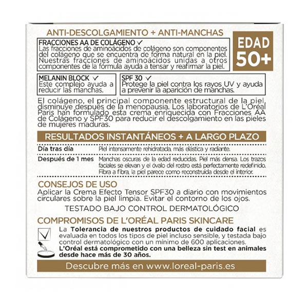 Los laboratorios de L’Oréal Paris han desarrollado esta crema enriquecida con Fracciones AA de Colágeno y SPF30 para ayudar a combatir el descolgamiento cutáneo en pieles maduras.