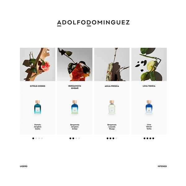 La fragancia fresca masculina de Adolfo Domínguez es un perfume vegano y natural, formulado con un 95 % de ingredientes de origen natural y alcohol 100 % procedente de fuentes naturales.