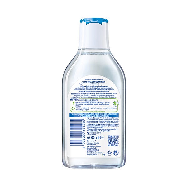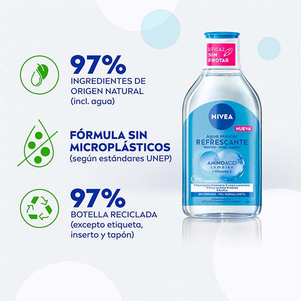 El 97% de sus ingredientes son de origen natural (incluido el agua) y su fórmula no contiene microplásticos. En NIVEA cuidamos tanto del planeta como de tu piel, por eso el envase está fabricado con un 97% de material reciclado (excepto etiqueta, inserto y tapón) y la fórmula es biodegradable, como la de nuestro Agua Micelar Refrescante.