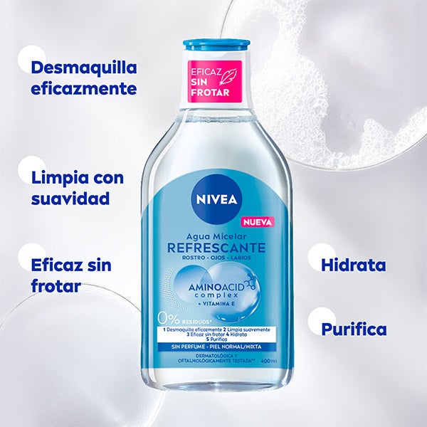 NIVEA Agua Micelar Refrescante Piel Normal / Mixta está desarrollada especialmente para limpiar en profundidad la piel normal o mixta, eliminando el maquillaje y las impurezas mientras aporta frescor e hidratación sin dejar restos. Su composición, con Amino Acid Complex y Vitamina E, combina micelas purificantes y aminoácidos para retirar fácilmente el maquillaje y la suciedad sin necesidad de frotar, dejando el rostro limpio y confortable.
