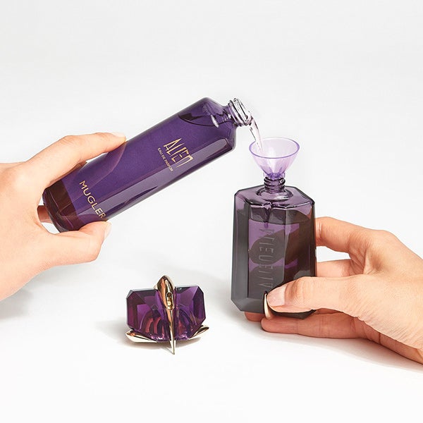 El perfume Alien en vaporizador recargable forma parte de la iniciativa sostenible de la marca. Desde 1992, con su primera creación, Mugler promueve un lujo responsable ofreciendo fragancias que pueden recargarse gracias a sus fuentes y frascos de rellenado.
