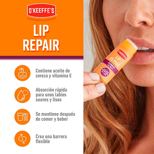 Gracias a sus 7 agentes humectantes y acondicionadores, Lip Repair de O'Keeffe’s mantiene su acción incluso mientras comes o bebes.