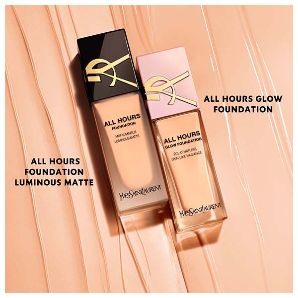Experimenta All Hours Glow Foundation de Yves Saint Laurent, una base de maquillaje que fusiona un acabado luminoso con una cobertura perfecta y duradera.