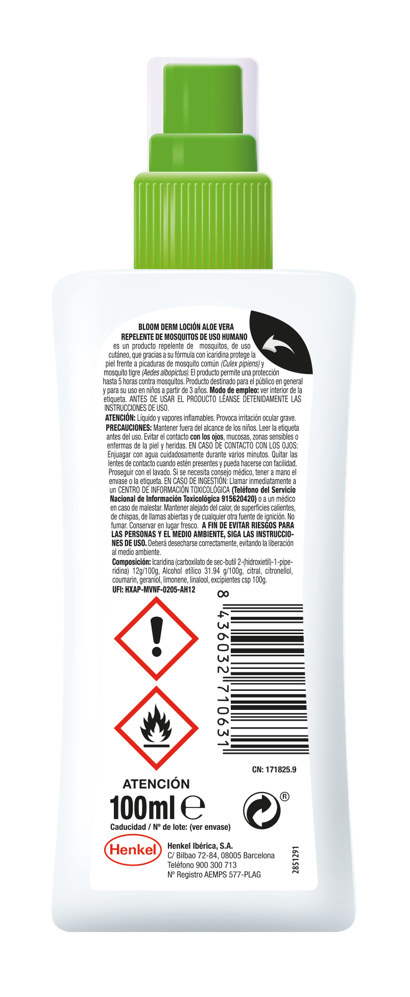 Bloom Derm Loción Aloe Vera cuenta con una fórmula enriquecida con icaridina que ofrece una absorción rápida y uniforme, brindando una protección eficaz frente a mosquitos comunes y tigre durante hasta 5 horas. Producto verificado dermatológicamente.