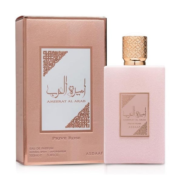 Ameerat Al Arab Prive Rose se presenta como una fragancia oriental, de aire femenino y refinado, que transmite una sensación de distinción. Su pirámide olfativa se inicia con acordes de uvas, naranja y manzana, para dar paso a un corazón floral formado por rosa, jazmín, lirio, ylang-ylang, gardenia y almizcle blanco, asentados sobre una base envolvente de sándalo, haba tonka y ámbar.