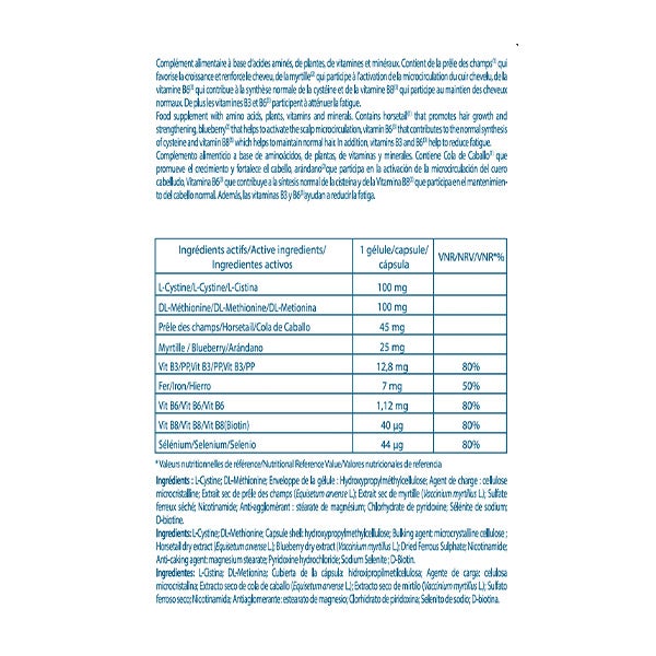L-Cistina; D-Metionina; Cubierta de la cápsula: hidroxipropimeticlulosa; Agente de carga: celulosa microcristalina; Extracto seco de cola de caball (Equisetum arvense L.); Extracto seco de mirtilo (Vaccinium myrtillus L.); Sulfato ferroso seco; Nicotinamida; Antiaglomerante: estearato de magnesio; Clorhidrato de piridoxina; Selenito de sodio; D-biotina.