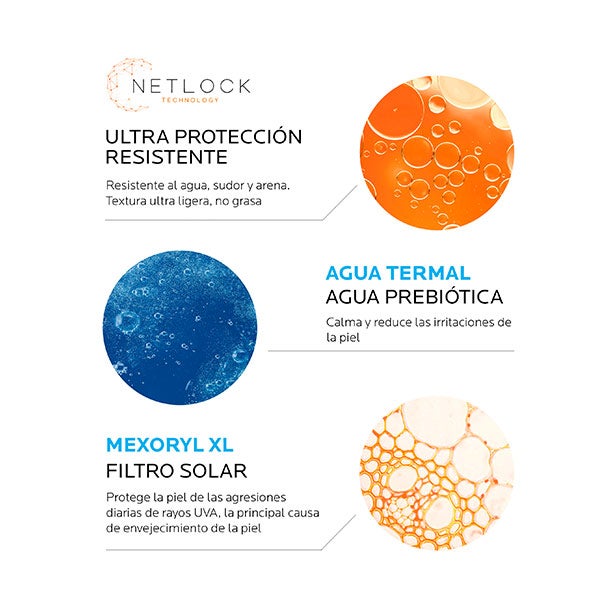 Leche hidratante que ofrece una defensa solar UVA/UVB de intensidad muy alta y con protección de amplio espectro, elaborada con la Netlock Technology. Esta innovación encapsula la emulsión y los filtros UV en microestructuras cristalizadas que otorgan una textura ligera, no grasosa y de gran resistencia. Además, presenta una composición formulada para respetar la vida marina y se envasa en un tubo de cartón que contribuye a una reducción del plástico en un -45%*.