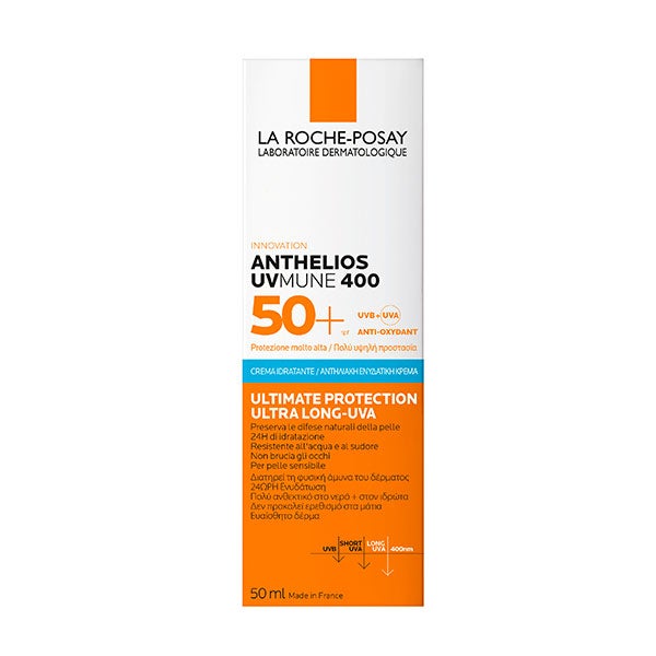 Anthelios UVMUNE 400 Crema Hidratante spf50+ es un fotoprotector facial que proporciona una defensa muy elevada y de amplio espectro, incluso frente a los rayos UV más difíciles de bloquear *(ULTRA-LONG UVA**, UVA/UVB/IR-A/polución). Está diseñado para todo tipo de piel, en especial aquellas sensibles o reactivas, y resulta perfecto para el uso cotidiano gracias a su acabado invisible.