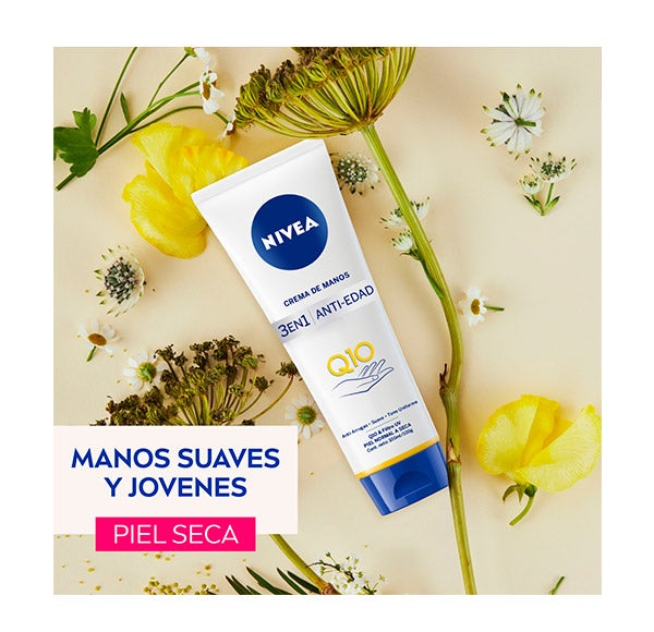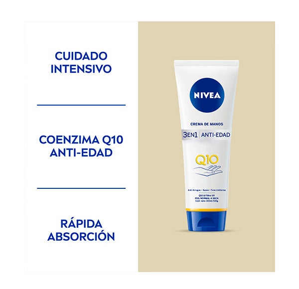 La fórmula antienvejecimiento de NIVEA Q10 Crema de Manos Antiedad 3 en 1, con Coenzima Q10 y filtros UV, contribuye a retrasar y atenuar los signos tempranos de la edad, así como la formación de manchas ocasionadas por la exposición solar. Su eficacia ha sido comprobada para proporcionar resultados visibles en la piel de las manos. De textura ligera y rápida absorción, también aporta cuidado diario a las cutículas. Favorece la energía natural de la piel, ayudando a mantenerla flexible y con aspecto firme.