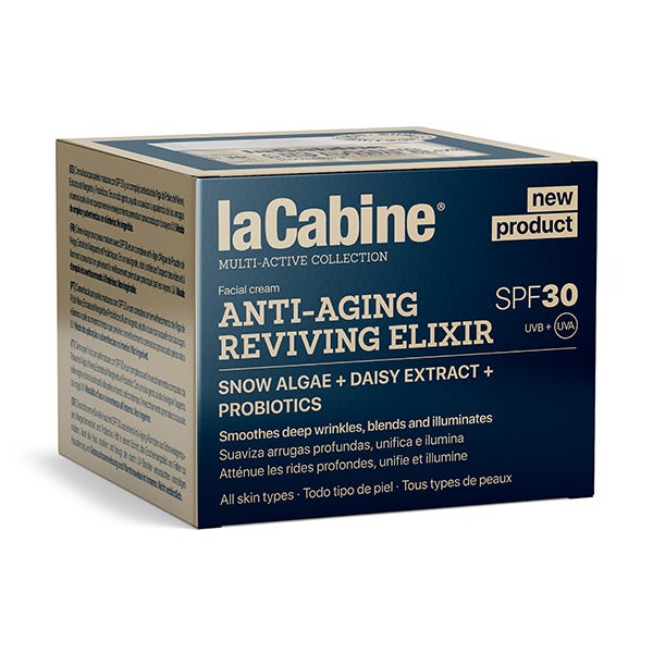 LaCabine Anti-aging Revive Elixir es una crema facial con SPF30 formulada para el cuidado de las pieles maduras, que combina un complejo antiedad a base de alga de polvo de nieve, extracto de margarita y probióticos.