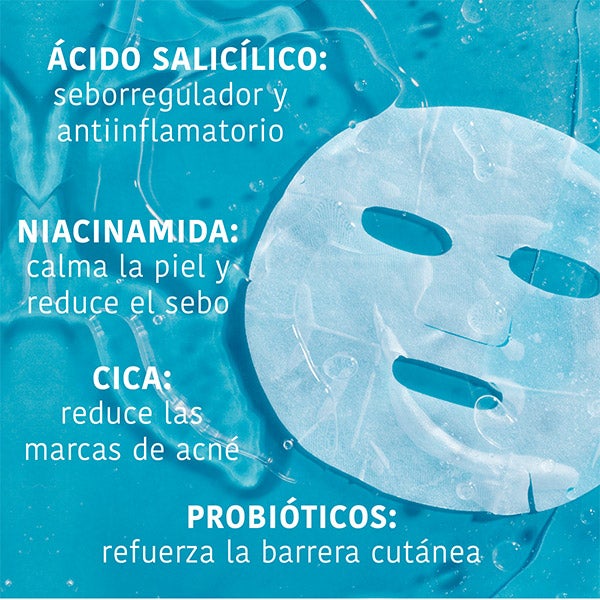 ÁCIDO SALICÍLICO: activo reconocido por su acción antiinflamatoria y antibacteriana, que regula el sebo y atenúa el enrojecimiento. NIACINAMIDA: reduce la inflamación y la rojez, controlando al mismo tiempo la producción de grasa, lo que ayuda a mantener los poros despejados y evitar nuevas imperfecciones. CENTELLA ASIÁTICA: promueve la regeneración cutánea y favorece la cicatrización, contribuyendo a disminuir las marcas residuales. PROBIÓTICOS: refuerzan la barrera protectora y equilibran la microbiota cutánea, ayudando a mantener un entorno saludable que limita la proliferación de bacterias responsables de los granos.