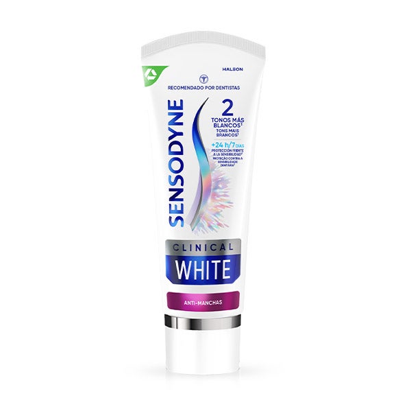 Sensodyne Clinical White Stain ofrece un efecto blanqueador con respaldo clínico, creado específicamente para quienes tienen dientes sensibles. Su fórmula de triple acción, clínicamente comprobada, incorpora componentes que favorecen un blanqueamiento más eficaz y contribuyen a evitar la aparición de nuevas manchas. Es adecuada para el uso diario, ya que no contiene peróxido de hidrógeno, ingrediente que podría incrementar la sensibilidad dental.