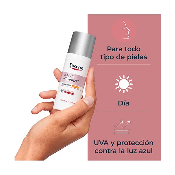 La luz solar, los desequilibrios hormonales y el paso del tiempo suelen causar hiperpigmentación. Para contrarrestarla, Eucerin ha creado Anti-Pigment Día FPS 30, una crema facial antimanchas con filtro solar que: