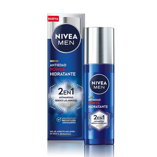NIVEA MEN Power Hidratante Antiedad 2 en 1 une el poder del Ácido Hialurónico con el componente patentado antimanchas Luminous630® para brindarte una crema de uso diario con protección solar FP30 y acción rejuvenecedora. Atenúa las manchas, ayuda a prevenir su reaparición y mejora la uniformidad del tono, dejando la piel con una apariencia más fresca y joven en tan solo cuatro semanas. Está pensada para hombres que desean un cuidado facial que no solo combata los signos de la edad, sino que también reduzca las zonas oscuras del rostro. 1. Aplicar cada día sobre la piel limpia. Para mantener la protección, reaplicar durante la jornada. Distribuir la crema por todo el rostro hasta su completa absorción. 2. Para maximizar los resultados, usar conjuntamente con NIVEA MEN POWER SERUM ANTIEDAD.