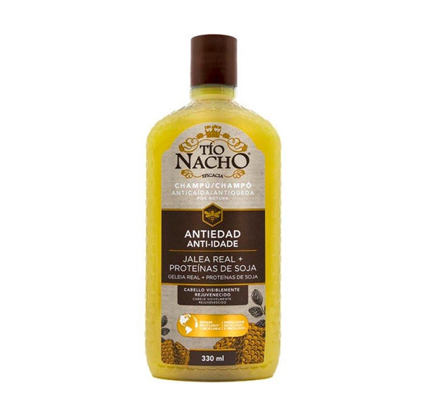 PREVIENE LA PÉRDIDA de cabello por fragilidad con TÍO NACHO ANTIEDAD, aportando una apariencia rejuvenecida, con más brillo, suavidad y aspecto sano. Gracias a la eficacia de su ingrediente estrella, la JALEA REAL, combinada con extractos naturales de Germen de Trigo, Aloe Vera y Soja.