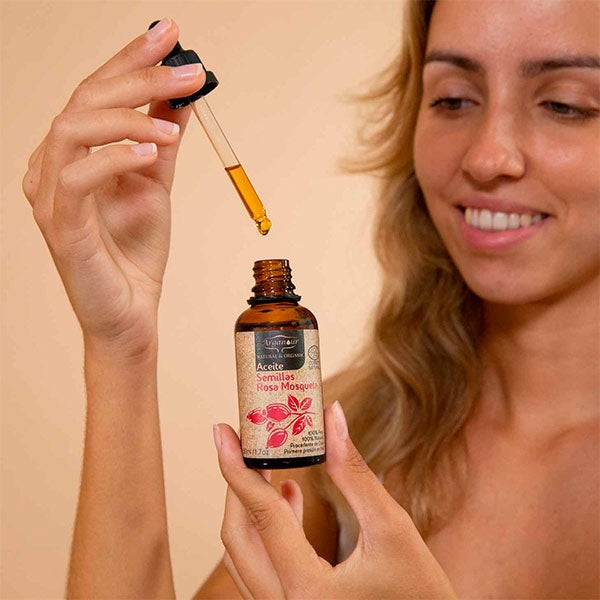 Aceite de semillas de rosa mosqueta 100% puro de Arganour, extraído mediante primera presión en frío, conserva una elevada concentración de ácidos grasos esenciales.