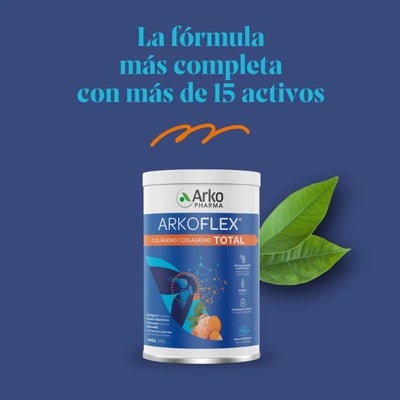 Arkoflex Colágeno Total sabor Naranja 390gr es un complemento alimenticio avanzado que contribuye al cuidado del sistema locomotor. Su fórmula innovadora combina colágeno hidrolizado y colágeno nativo tipo II, apoyados por ingredientes clave como ácido hialurónico, magnesio, manganeso, glucosamina y condroitina. Además, incluye extractos naturales de boswellia y cúrcuma, junto con lithothamnium, una fuente natural de calcio. Esta combinación única está enriquecida con 7 vitaminas esenciales (C, B1, B2, B6, B12, D3 y K2), que ayudan a mantener una función articular, ósea y muscular óptima.