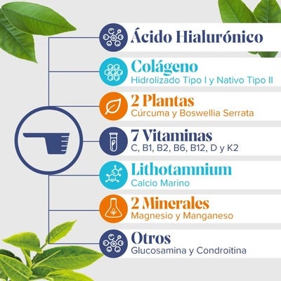 - ácido hialurónico (25mg): Contribuye a la hidratación y lubricación de las articulaciones.