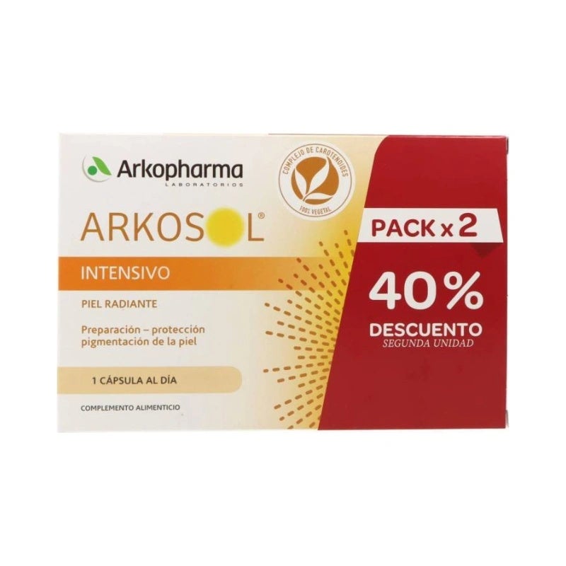 Arkosol Intensivo 2x30 Cápsulas es un complemento alimenticio avanzado diseñado para preparar y proteger tu piel frente a la exposición solar. Su fórmula rica en carotenoides como el betacaroteno, luteína, zeaxantina y licopeno, ayuda a mejorar la uniformidad del bronceado, dándole a tu piel un aspecto más radiante y saludable. A diferencia de los productos que solo contienen betacaroteno, Arkosol Intensivo potencia sus beneficios gracias a la acción de la Phytopérine®, un extracto de pimienta negra que mejora la absorción de nutrientes, maximizando la biodisponibilidad del betacaroteno.