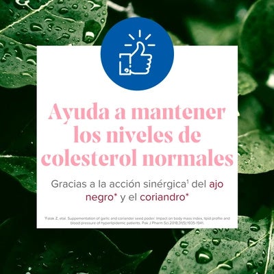- Extracto de bulbo de ajo negro (Allium sativum L.): 250 mg por cápsula, equivalente a 2100 mg de planta seca, con 430 µg de S-alil-L-cisteína, conocido por sus propiedades antioxidantes.