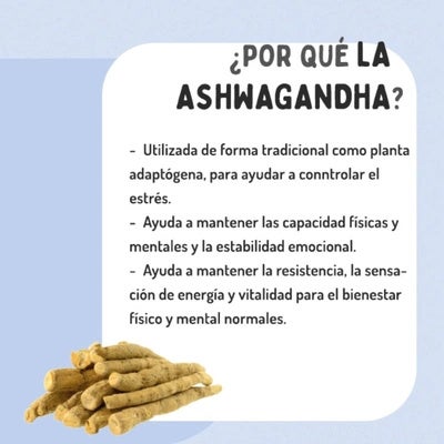La ashwagandha, una planta tradicional de la medicina ayurvédica, ayuda a mantener la resistencia, la sensación de energía y vitalidad y el bienestar físico y mental normales. La ashwagandha ayuda a mantener la estabilidad emocional normal. Ayuda a mantener las capacidad físicas y mentales en condiciones normales y la función mental.
