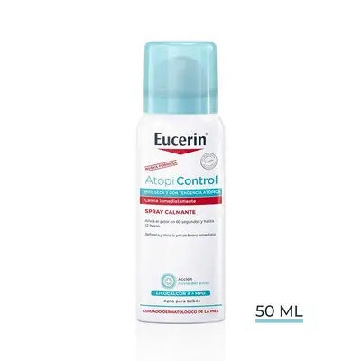 Eucerin AtopiControl Spray Calmante es una solución práctica para aliviar las zonas del cuerpo con picor asociado a la dermatitis atópica, pudiéndose utilizar en cualquier etapa de esta condición. Su formato portátil resulta cómodo para llevar y es compatible con el uso de Eucerin AtopiControl Crema Forte y el tratamiento habitual indicado por el médico.