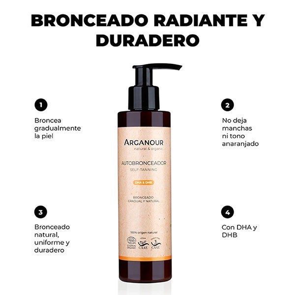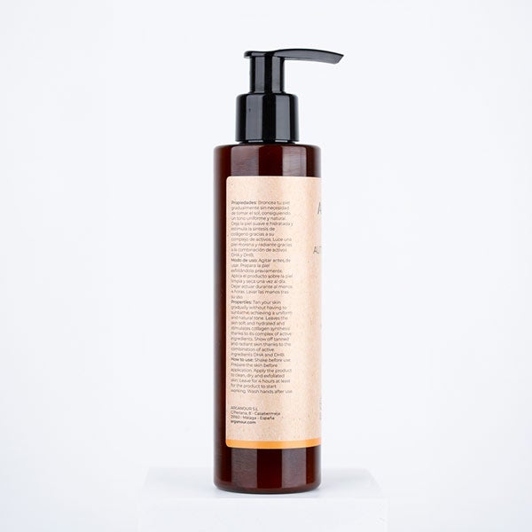 Después, distribuye el autobronceador de Arganour sobre las zonas que desees broncear y extiende con suavidad. Empléalo a diario para disfrutar de un bronceado prolongado, ya que la coloración se desarrollará de manera gradual.