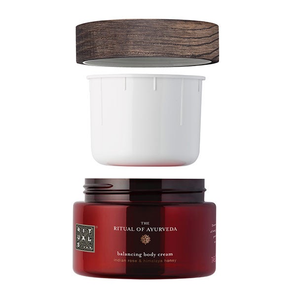 Elige la recarga eco-chic de la crema corporal The Ritual of Ayurveda para mimar tu piel mientras contribuyes al cuidado del planeta.