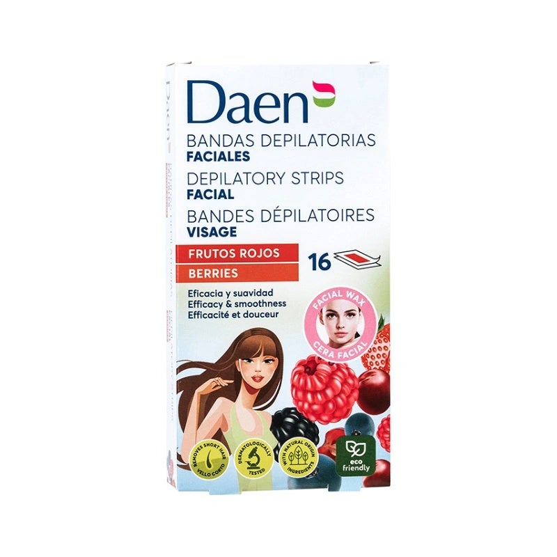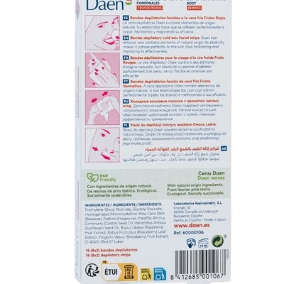 Las bandas depilatorias Daen Aqua gracias a su avanzada formulación hacen que los restos de cera que quedan sobre la piel tras la depilación puedan limpiarse con agua tibia. Ello hace que no sea necesario el uso de toallitas de aceite post depilación y que la depilación sea, además de efectiva, rápida, cómoda y agradable. Eficaces incluso en vello corto, e incorporan en formulación frutos rojos, conocidos por sus propiedades antioxidantes.