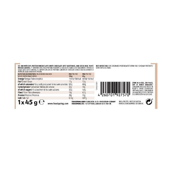 Una refinada combinación de moca intenso y sedoso chocolate blanco, adornada con crujientes nibs de cacao, ideal para disfrutar de una experiencia de sabor a café sin contener cafeína.