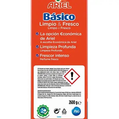 Ariel se preocupa por ofrecer productos efectivos y responsables con el medio ambiente. La fórmula de Ariel en polvo Básico ha sido desarrollada pensando en la sostenibilidad, ya que es biodegradable y amigable con los sistemas de tratamiento de aguas residuales. Además, el empaque ha sido diseñado para ser reciclable, contribuyendo así a la reducción de residuos y promoviendo el cuidado del entorno.