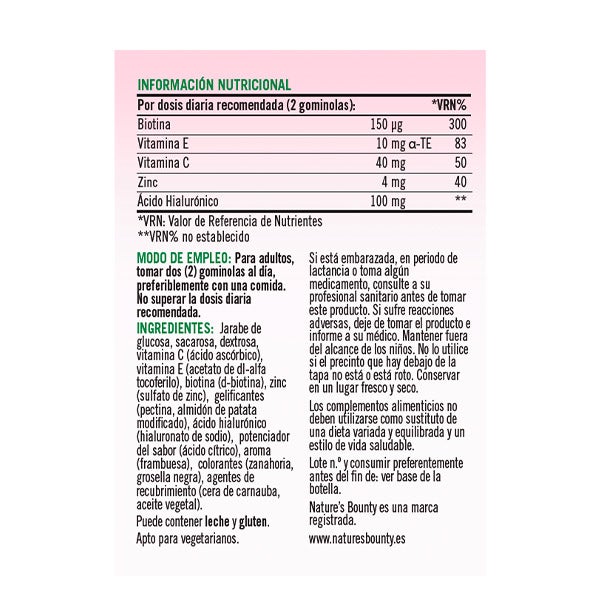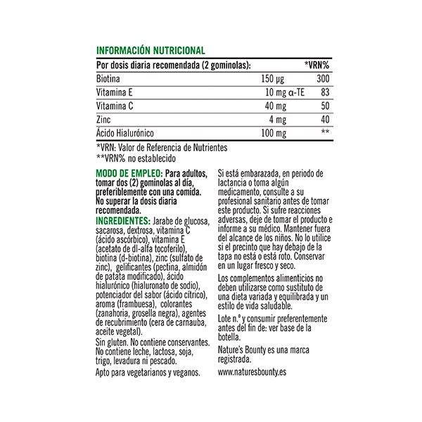 La dosis de dos gominolas proporciona: Ácido hialurónico 100 mg, Vitamina C 40 mg, Vitamina E 10 mg, Zinc 4 mg y Biotina 150 mcg.
